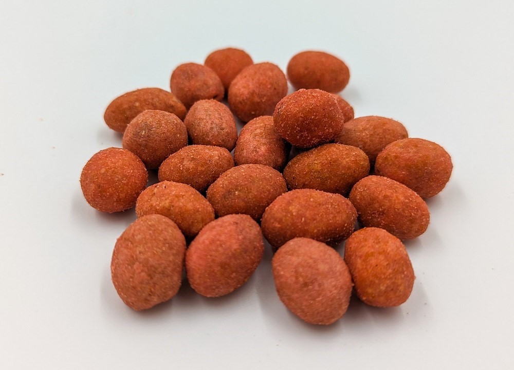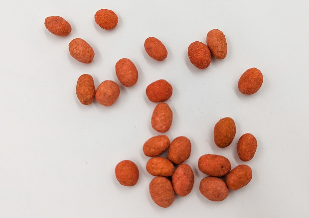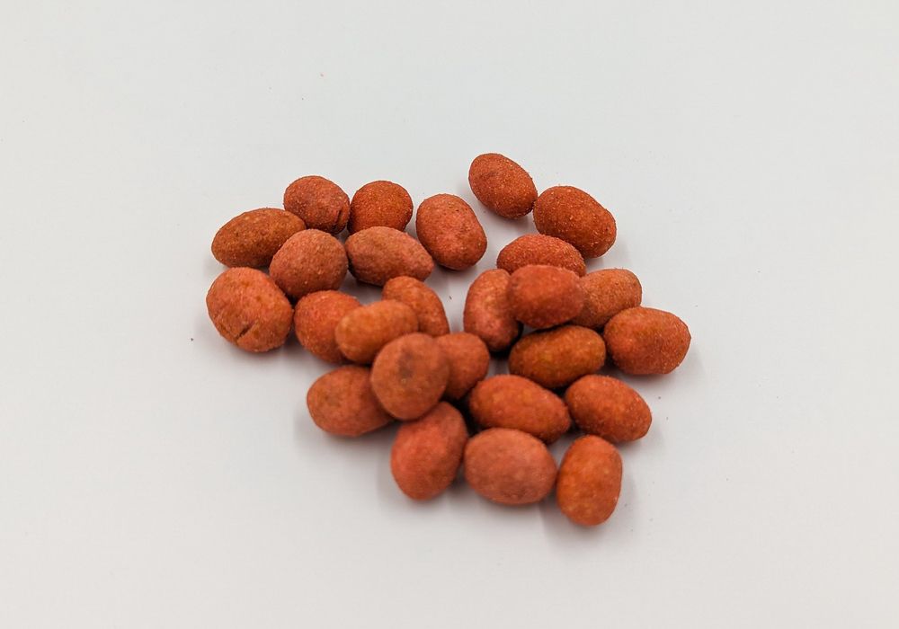 Ядро сырого арахиса, оболочка из теста (пшеничная мука, кукурузный крахмал, стабилизатор Е1422, поваренная соль, сахар), фритюрная смесь, комплексная пищевая добавка: "Краб", комплексная пищевая добавка краситель: Кармуазин (Е122).